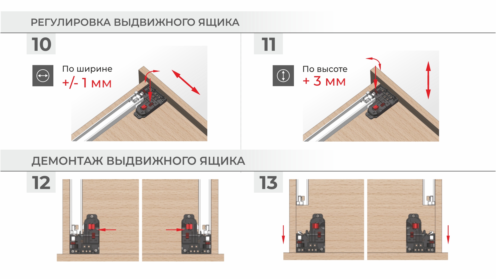 • расширенные возможности регулировки положения фасада: по высоте +3 мм и по ширине +/-1 мм. Регулировка производится при помощи подвижных колёсиков на клипсе и не требует использования инструментов.