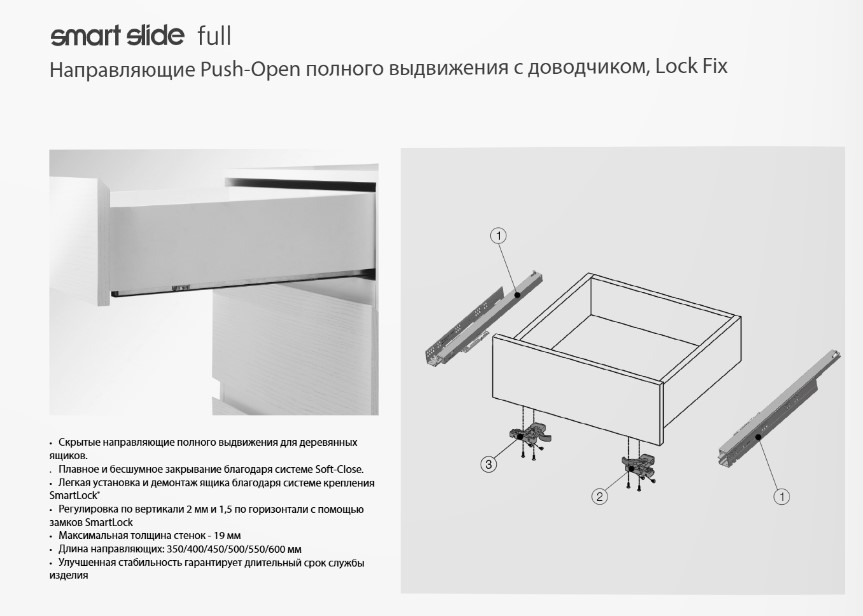 САМЕТ Напр. SMART SLIDE PUSH OPEN полного выдв. c довод., 550 мм, 127.230.307