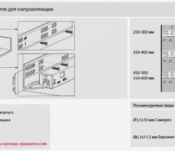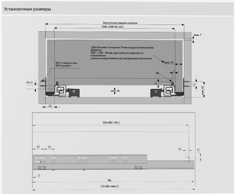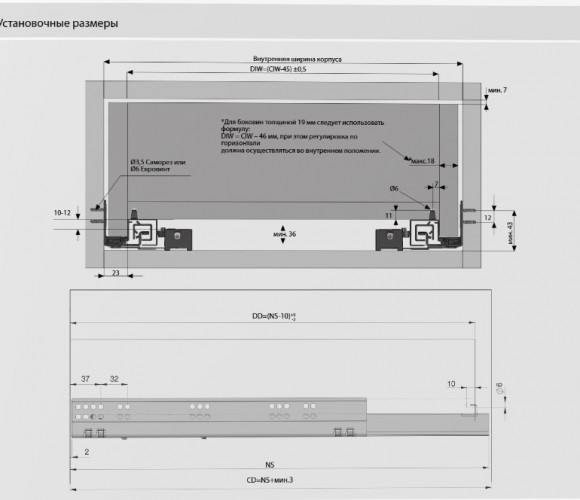 Возможность установки ящика с толщиной боковин толщиной до 19 мм