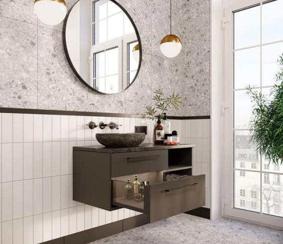 • Стеклянные боковины ящиков добавляют интерьеру необычный выразительный элемент.