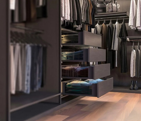 В первую очередь данная система предназначена для гардеробных, но также может использоваться в ванных комнатах и в кухонных помещениях.