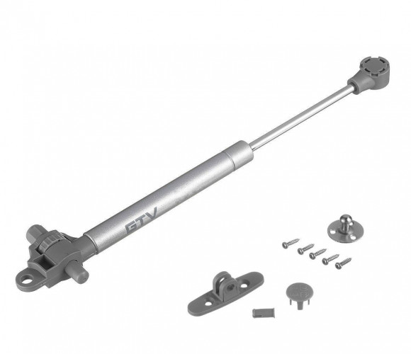 Подъёмник газовый с амортизатором 150N GTV, серый - мебельный подъемник, в конструкции которого предусмотрены доводчик и амортизатор. При правильной регулировке газлифта, в момент закрывании фасада исключается удар и сопутствующий ему шум.