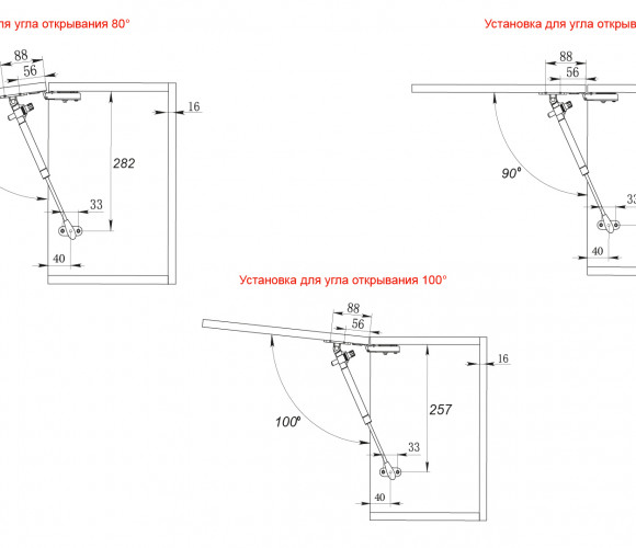 Газовый лифт поставляется в комплекте с шаблоном-инструкцией для установки, которая поможет легко и быстро произвести монтаж, а также и выбрать угол открывания фасада 80°, 90° или 100°.