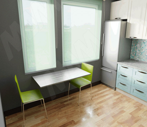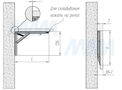 Примечание: отсутствие зазора между стеной и полкой в рабочем состоянии; зазор между стеной и опущенной полкой — 18 мм