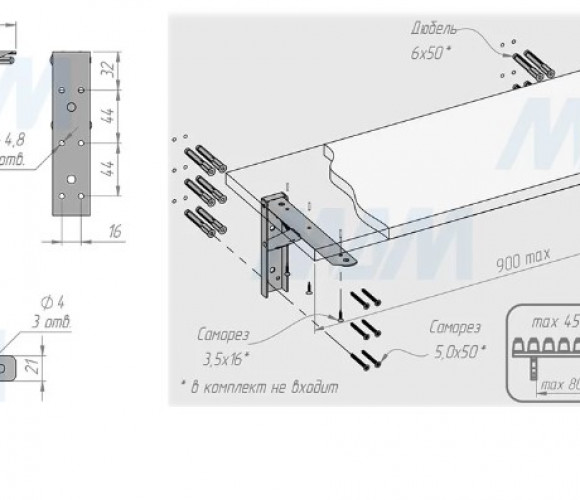 Комплектация: менсолодержатель — 2 шт., крепёж (саморезы 4×25 мм — 14 шт.)