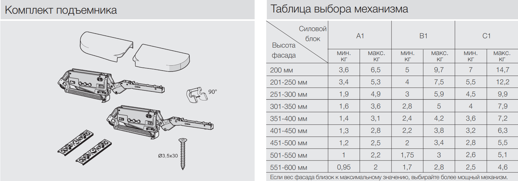 Выбор механизма осуществляется согласно таблицы подбора исходя из веса и высоты фасада. Если вес или высота фасада близки к максимальным, то необходимо выбрать более мощный механизм