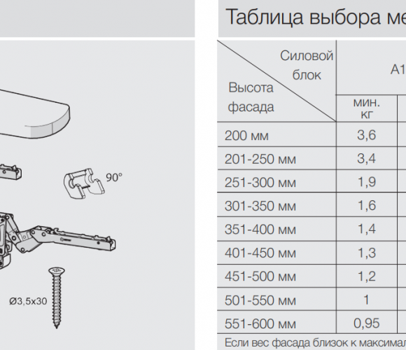 Выбор механизма осуществляется согласно таблицы подбора исходя из веса и высоты фасада. Если вес или высота фасада близки к максимальным, то необходимо выбрать более мощный механизм