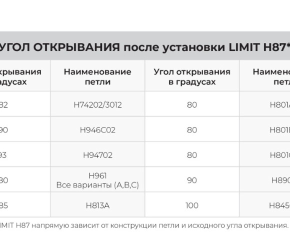 LIMIT H87 — ограничитель угла открывания петель, выполнен из надёжного пластика и отличается высокой устойчивостью к интенсивной эксплуатации.