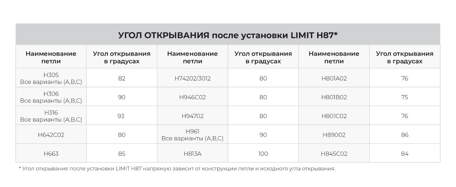 Ограничитель LIMIT H87 невозможно установить в модели петель H740, Н640 ввиду особенностей конструкции петель.