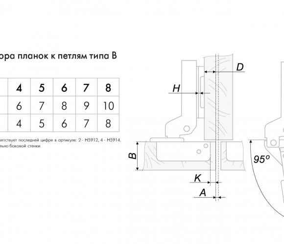 Как и другие представители линейки NEO модель Н319 является конструктором: ответные планки к петле подбираются исходя из индивидуальных монтажных значений. Для Н319 созданы две монтажные планки разной высоты — Н5912 и Н5914. Они индивидуальны для петли EXTRA Н319 и не подходят к другим моделям линейки NEO. Монтажные планки Н5912 и Н5914 приобретаются отдельно исходя из толщины фасада и боковины корпуса, значения «К» (расстояние до чашки) и ряда других параметров, которые высчитываются по формулам для петель типа А, В и С (формулы размещены в карточке товара).
