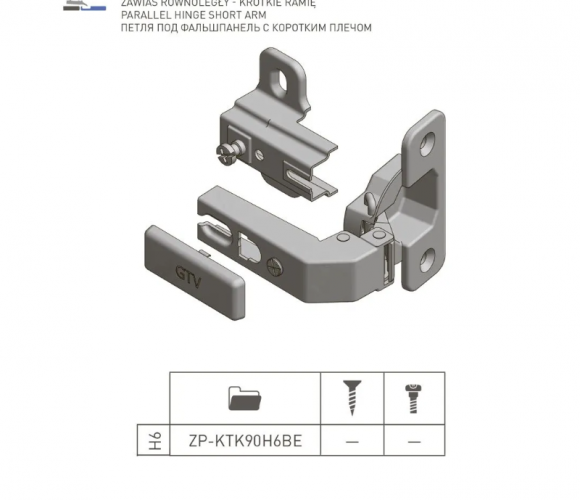 Петля накладная GTV 90 градусов, H-6, короткое плечо для фальшпанелей без евро ZP-KTK90H6BE - механизм для открывания фасада под определенным углом, в соответствии с конфигурацией мебельной конструкции. В частности, применяется при использовании в кухонных гарнитурах декоративных плит – фальшпанелей.