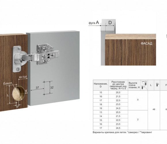 Модель можно укомплектовать разными видами планок: трапециевидной формы, с высотой 0 или 2 мм, с вкрученными евровинтами или с креплением на саморезы, а также декоративными заглушками на чашку и на тело петли и ограничителем угла открывания LIMIT H87. Планки и аксессуары приобретаются отдельно.