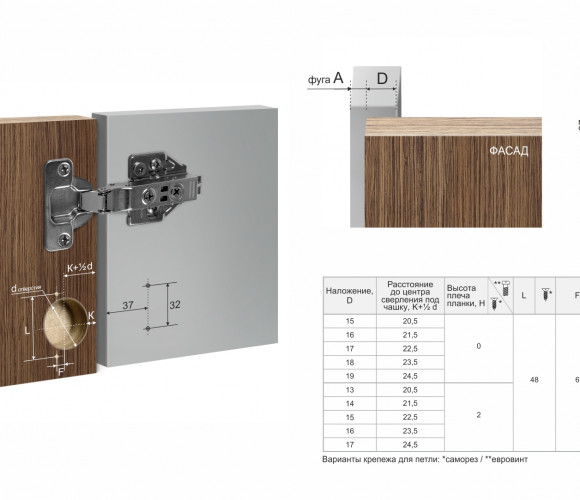 Модель можно укомплектовать разными видами планок: трапециевидной формы, с высотой 0 или 2 мм, с вкрученными евровинтами или с креплением на саморезы, а также декоративными заглушками на чашку и на тело петли и ограничителем угла открывания LIMIT H87. Планки и аксессуары приобретаются отдельно.