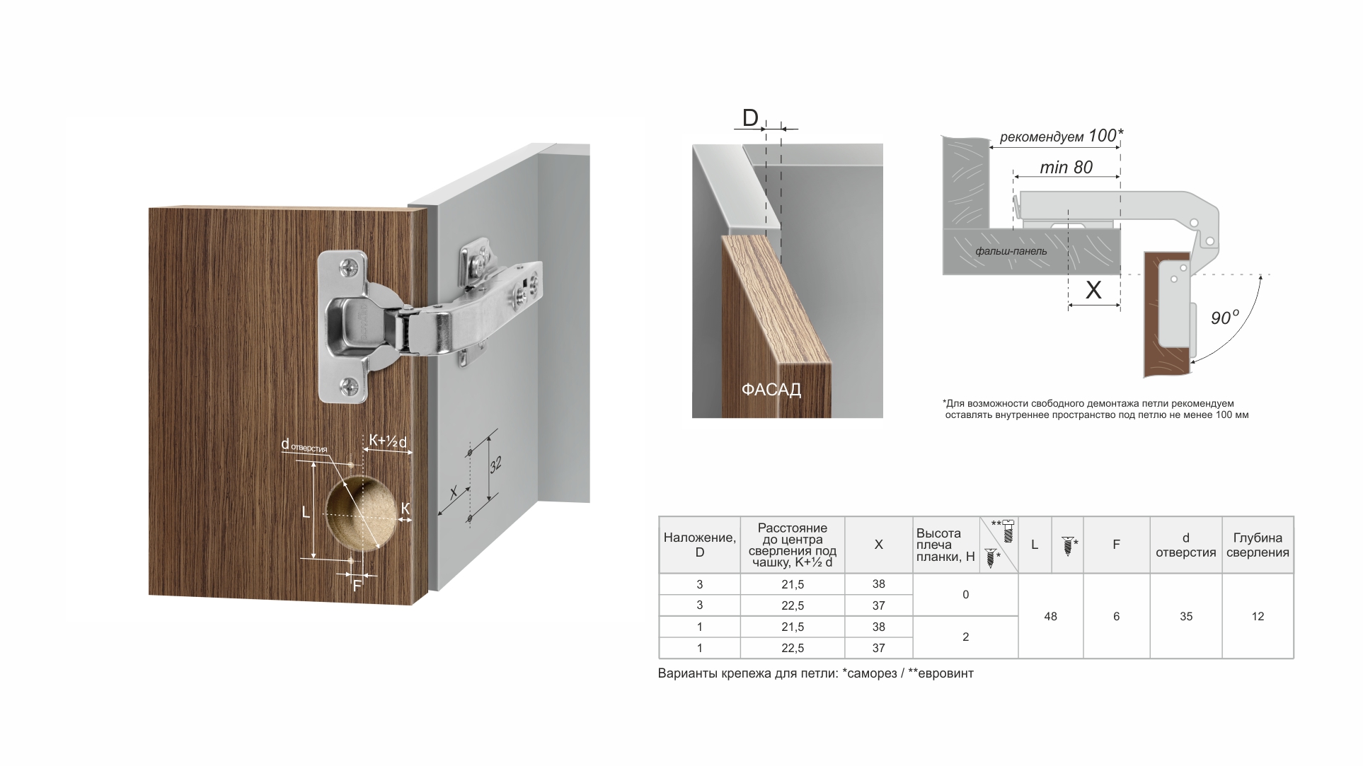 - Быстрый монтаж Clip-on и система QuickClick для монтажа петли с одной или другой стороны планки на усмотрение сборщика;