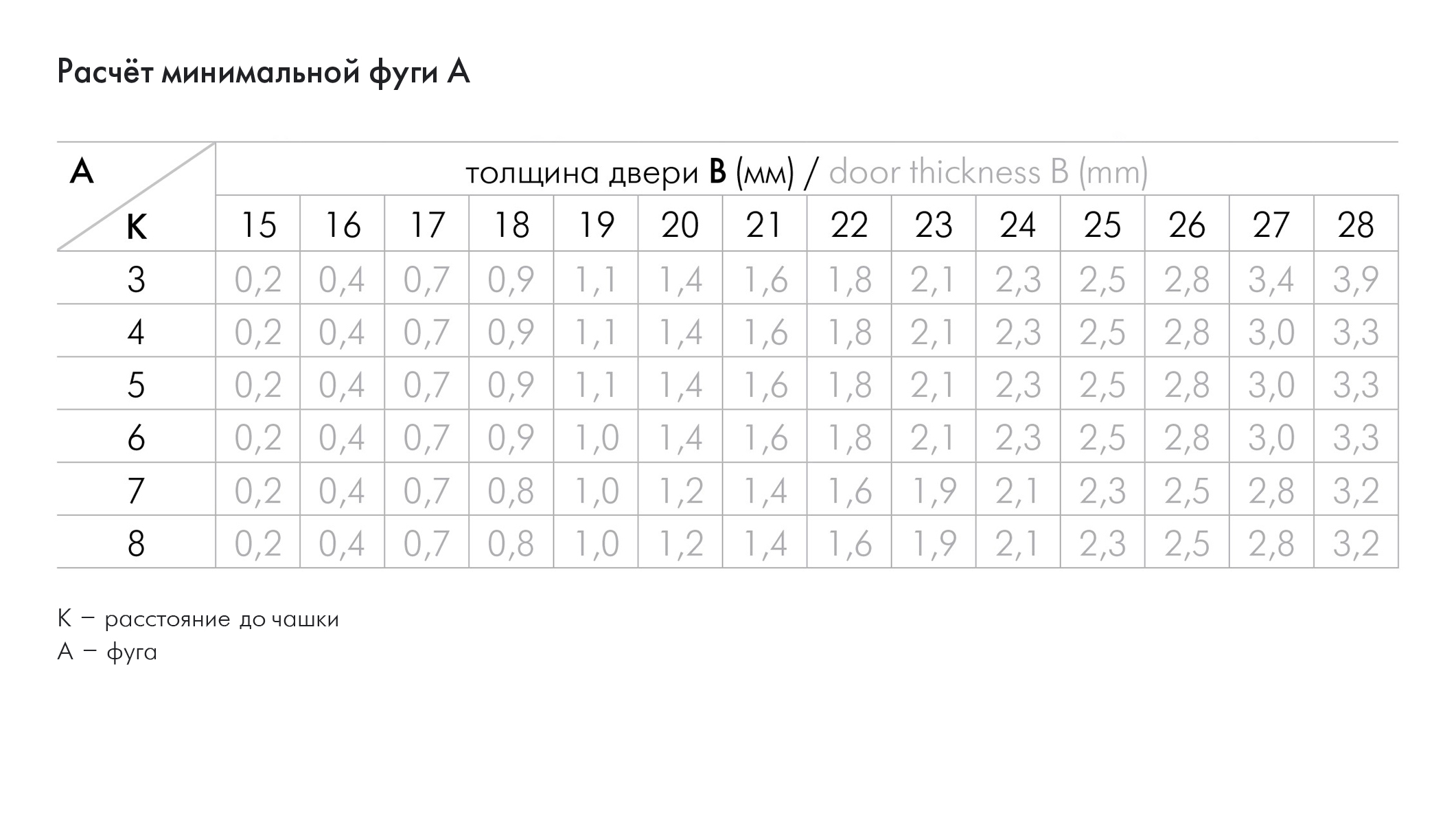 Для подбора подходящей планки в первую очередь необходимо определить минимальное значение фуги А по таблице «Расчёт минимальной фуги», затем высчитать наложение фасада и далее подобрать ответную планку с помощью таблицы подбора планок. Для фасадов увеличенной толщины — более 22 мм — рекомендуется с особым вниманием отнестись к данному расчёту.