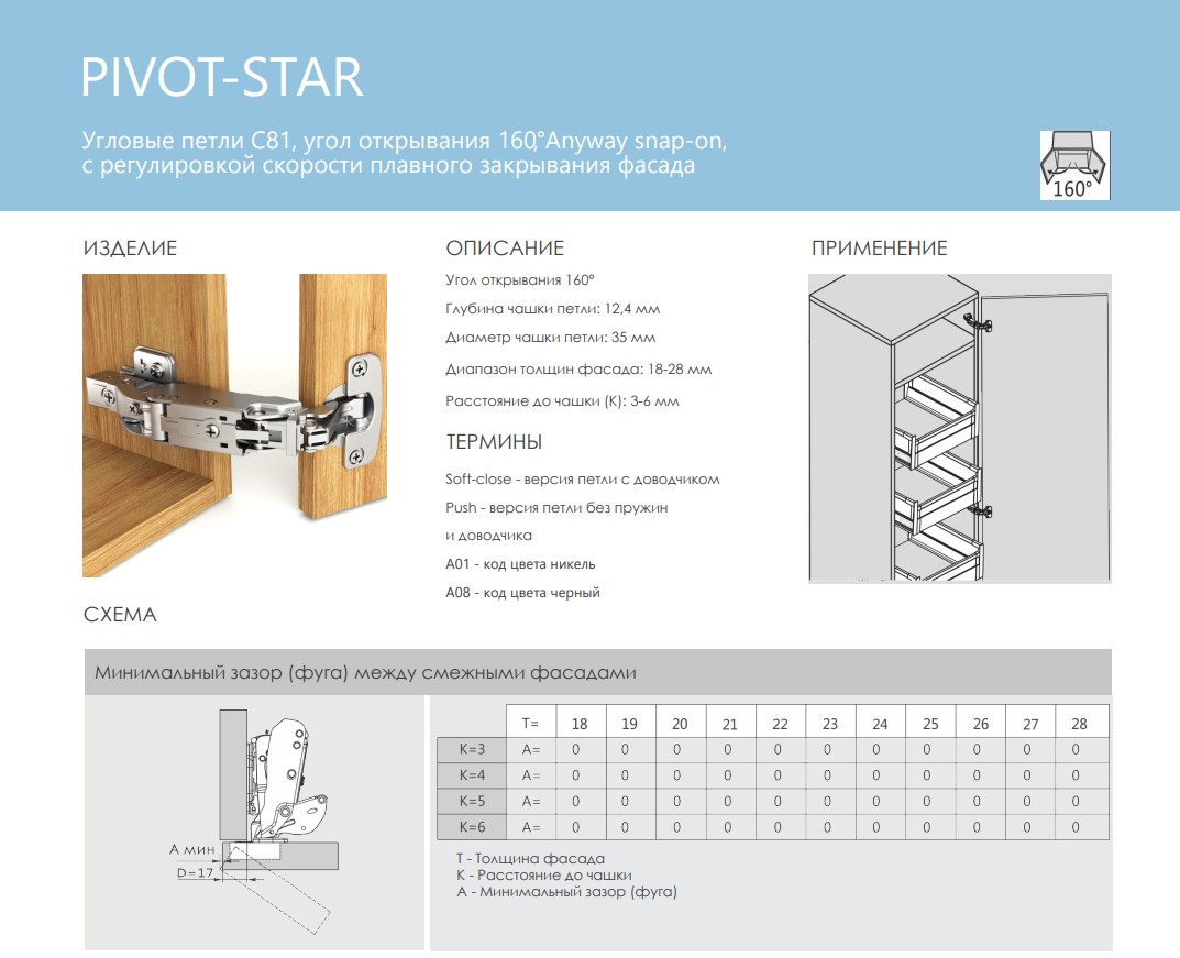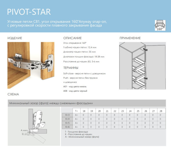 Петля DTC PIVOT-STAR new 160°, накладная, с довод (C81A805FAB) 0020210