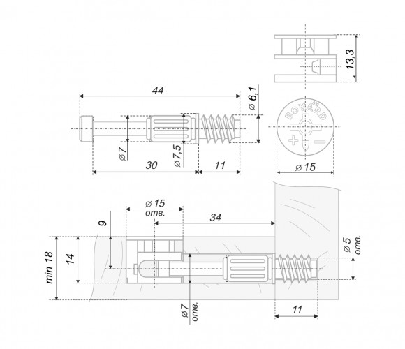 Красный поворотный фиксатор позволит удобно удерживать дюбель при монтаже в пласть. Наличие зауженного стартового витка гарантирует плавное закручивание стяжки без повреждения поверхности. Высота эксцентрика требует отверстия под сверление 14 мм.