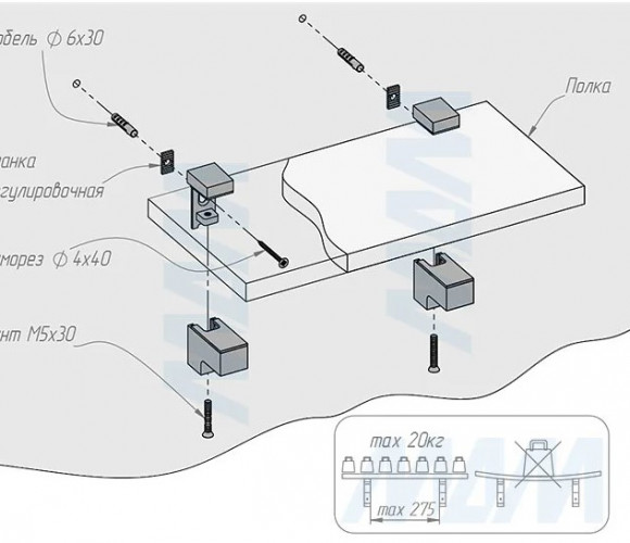 Комплектация: менсолодержатель — 1 шт., саморез 4×40 мм — 1 шт., дюбель 6×30 мм — 1 шт., планка регулировочная — 1 шт.
