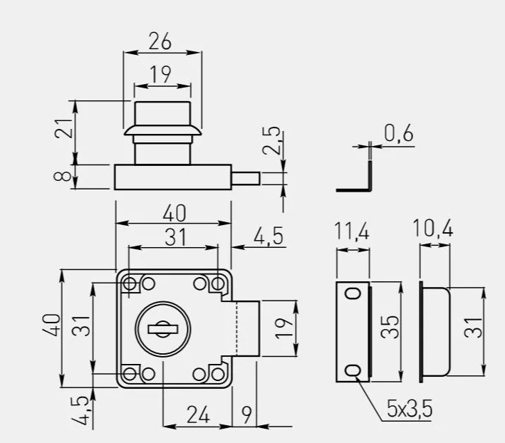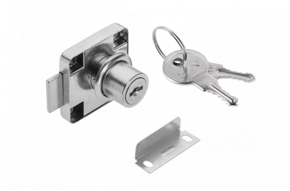 Замок мебельный 138 с планкой, простой (металлический) ключ - устройство, служащее для запирания дверей и ящиков мебельных изделий. Фиксация в закрытом состоянии осуществляется посредством поворота ключа.