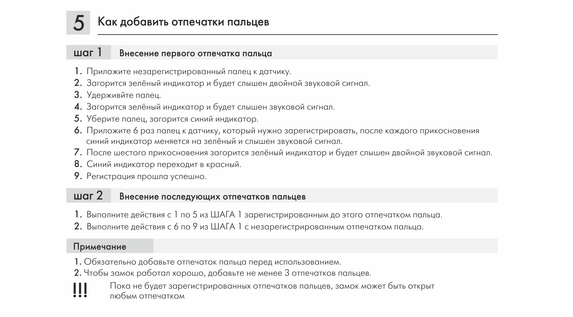 Модель обладает высокочувствительным быстро реагирующим биометрическим датчиком. К замку можно настроить до 20 отпечатков пальцев. До момента настройки замок может открыть любой отпечаток.