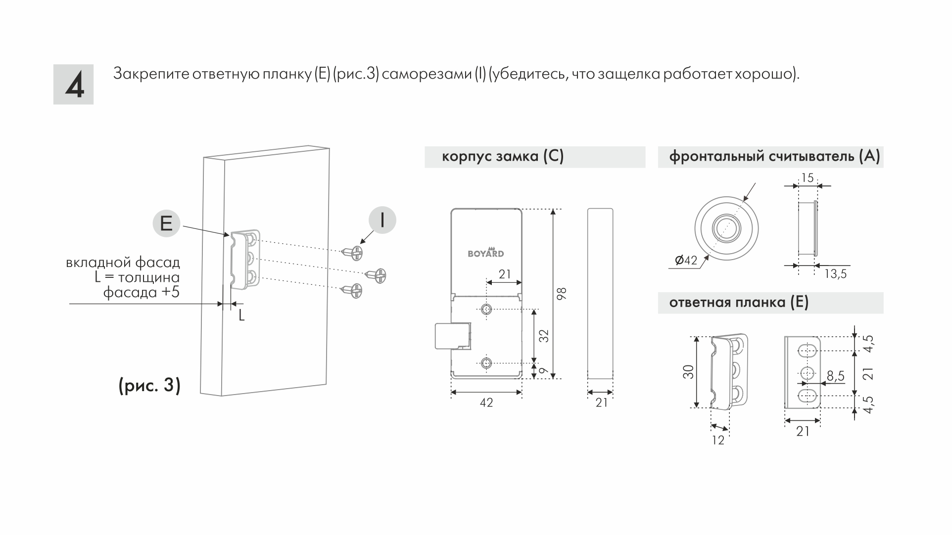 Замок Z604 легок в установке. Фронтальный считыватель врезной, а ответная часть замка монтируется с обратной стороны фасада накладным способом. Подходит для фасадов с ручками и для PUSH, для распашных и для выдвижных фасадов.