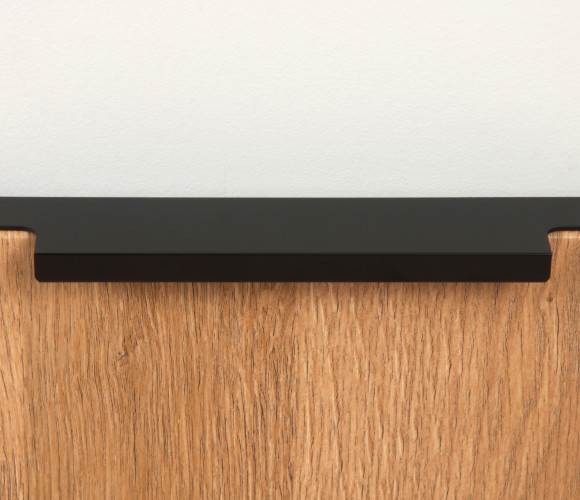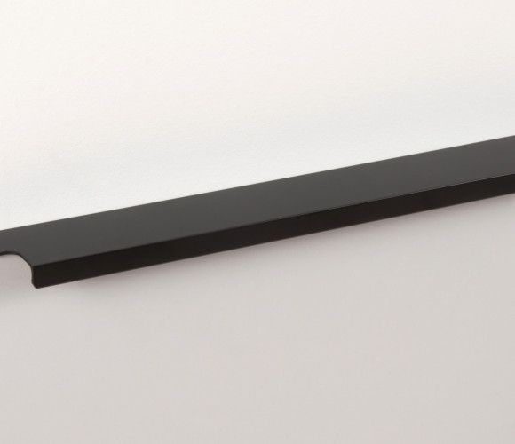 Торцевая ручка для современной мебели. Благодаря лаконичному дизайну и чётким линиям модель будет удобна в использовании и подойдёт для многочисленных стилевых направлений, таких как лофт, модерн, минимализм, pro-line и contemporary. Устанавливается на фасады толщиной до 18 мм и крепится накладным способом двумя вариантами — «в размер» фасада или по центру широких фасадов (как большой «язычок»).