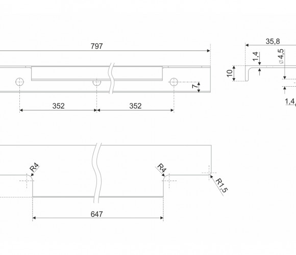 Ручка имеет богатую палитру цветовых решений и разнообразие длин. Данная модель допускает размещение двумя способами — «в размер» фасада и по центру широких фасадов (как большой «язычок»).