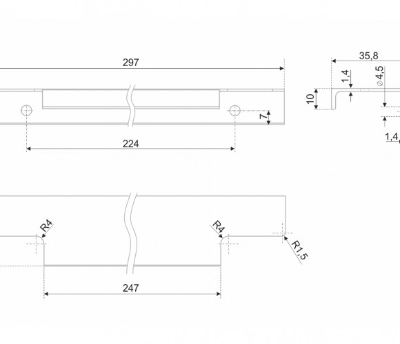 Ручка имеет богатую палитру цветовых решений и разнообразие длин. Данная модель допускает размещение двумя способами — «в размер» фасада и по центру широких фасадов (как большой «язычок»).