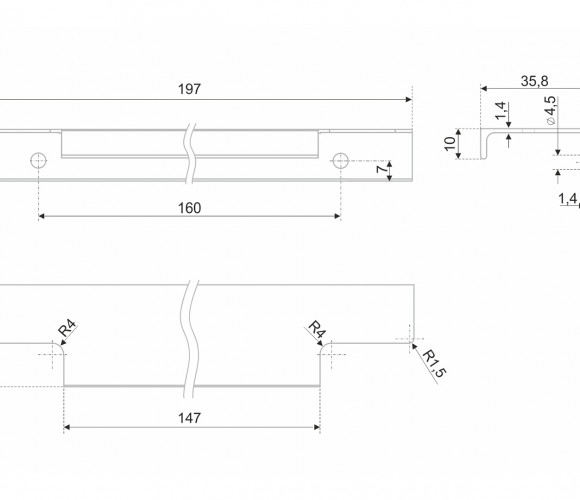 Ручка имеет богатую палитру цветовых решений и разнообразие длин. Данная модель допускает размещение двумя способами — «в размер» фасада и по центру широких фасадов (как большой «язычок»).