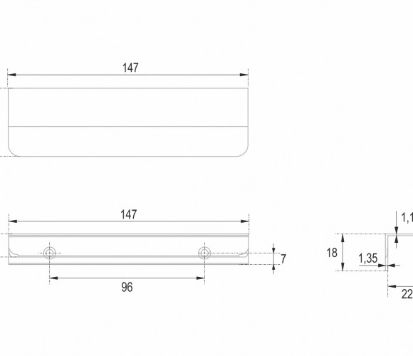KANT RT013 можно устанавливать не только вертикально, но и горизонтально — для завершённого образа мебельного гарнитура. Модель закрепляется на верхний торец фасада, саморезы (приобретаются отдельно) вкручиваются в отверстия с фаской с задней стороны фасада.