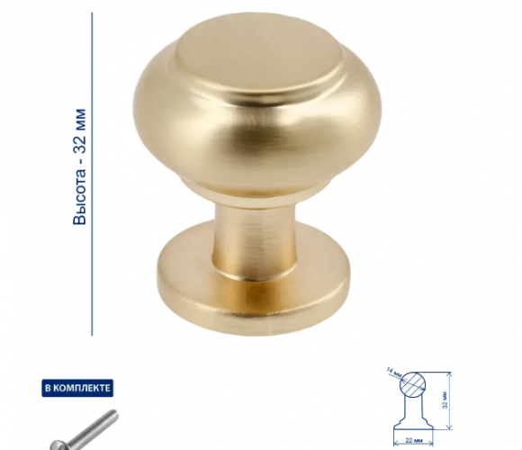 Ручка STILO, брашированное золото - элегантная лицевая фурнитура, ручка-кнопка округлой формы и с плоской шляпкой, не только открывающая дверцу, но и украшающая интерьер.
