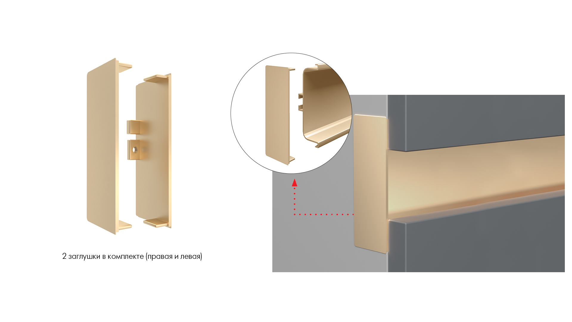 RZ050.04 - закрытые заглушки из цинк-алюминия для стильного и эстетичного оформления среза горизонтального профиля GOLA BALANCE по краям гарнитура, на стыке с посудомоечной машиной, духовым шкафом или мебельным модулем.