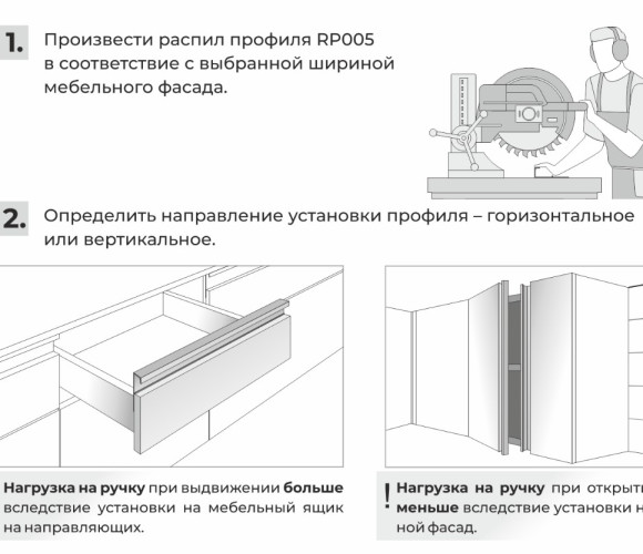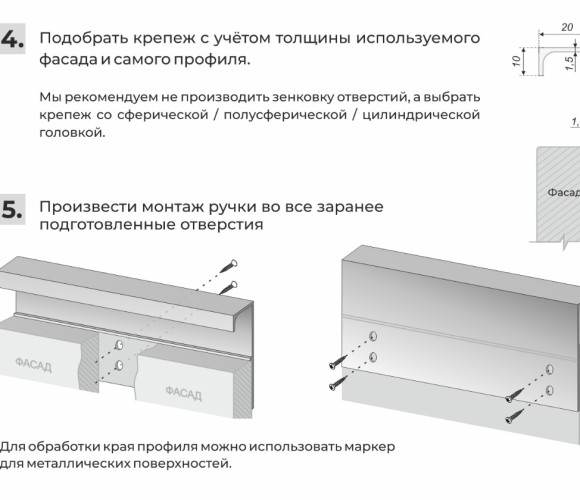 Монтаж ручки не требует дополнительной фрезеровки, профиль накладывается на фасад и закрепляется саморезами с задней стороны. Быстро и просто! Подходит для фасадов любой толщины.