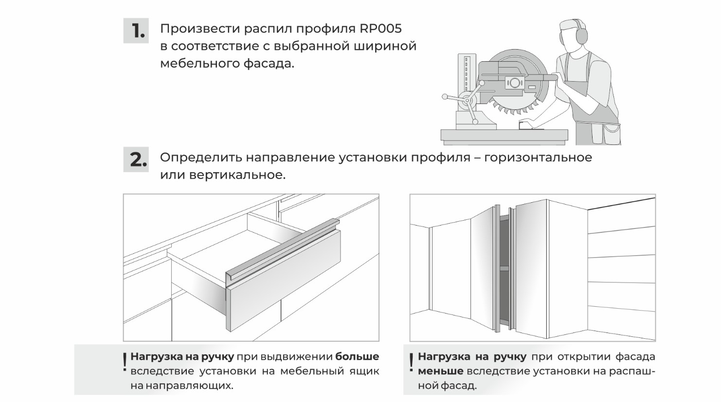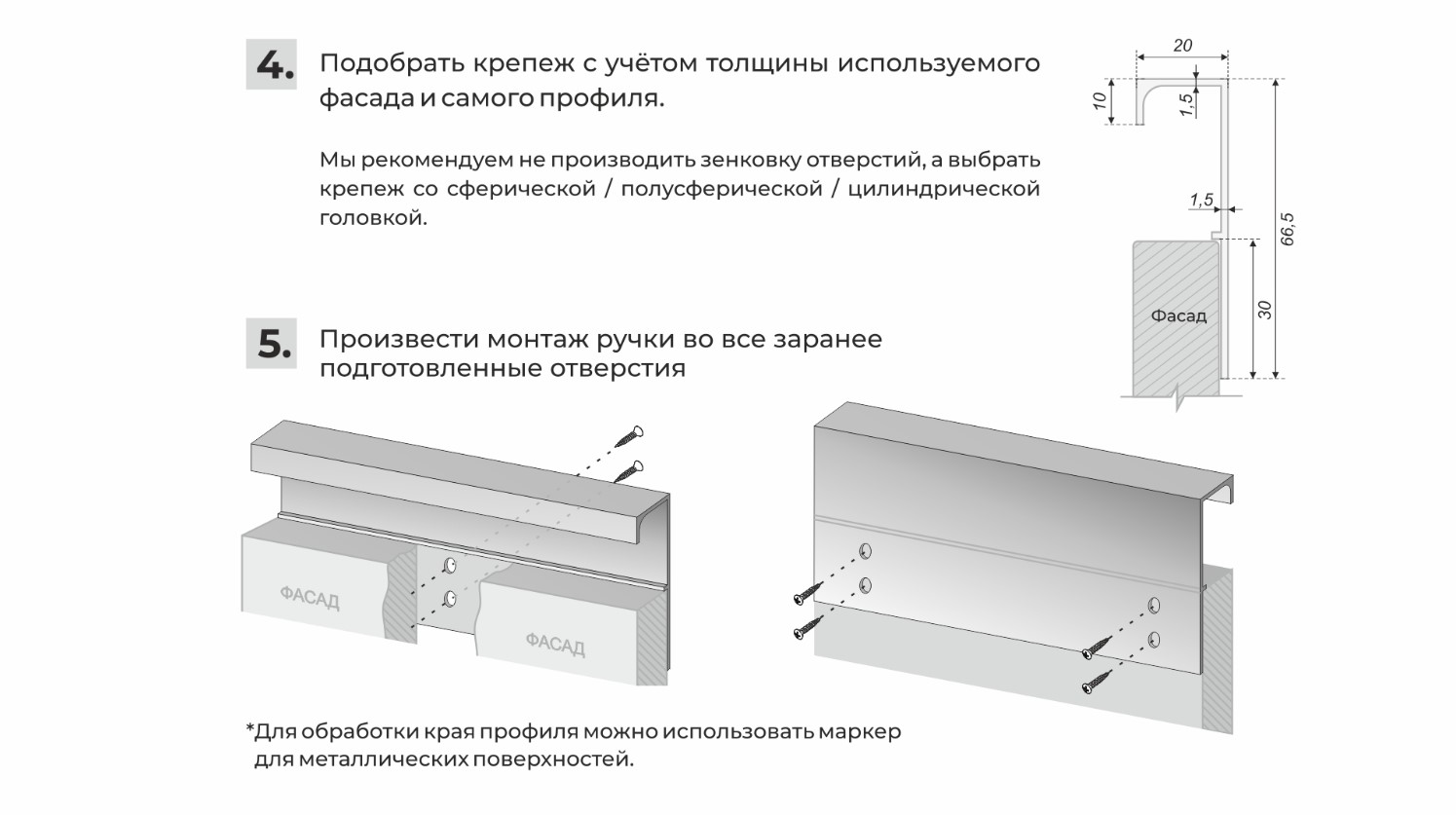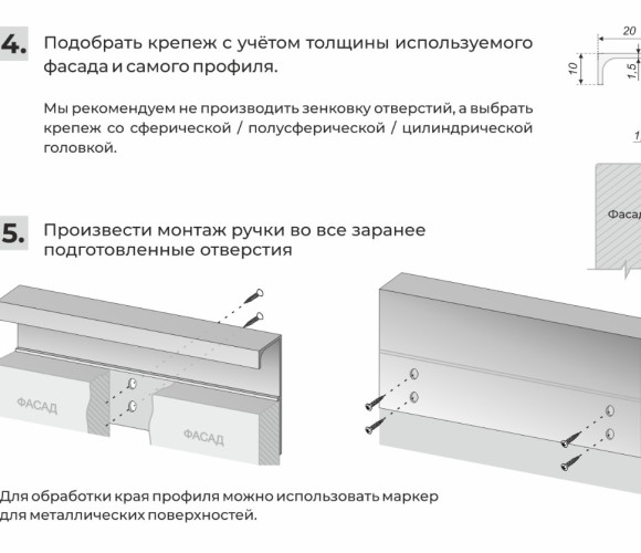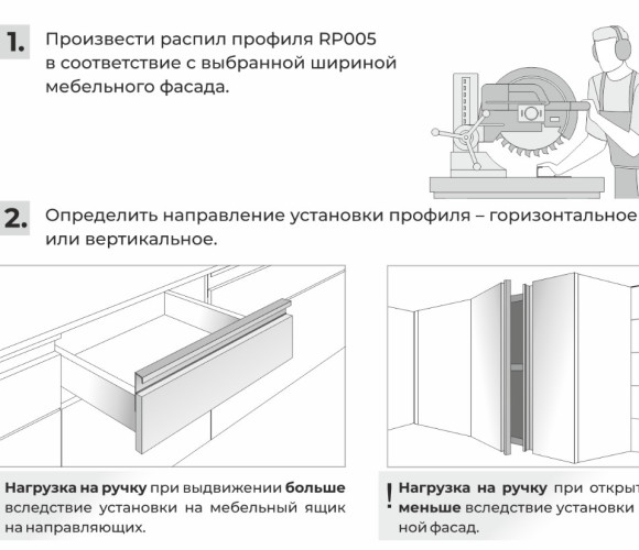 Монтаж ручки не требует дополнительной фрезеровки, профиль накладывается на фасад и закрепляется саморезами с задней стороны. Быстро и просто! Подходит для фасадов любой толщины.