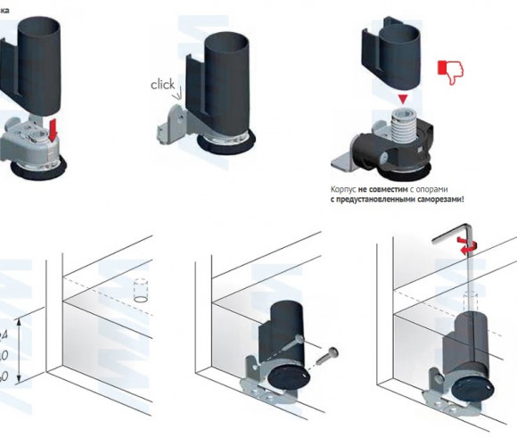 • на опоре имеются два шипа, которые фиксируются на торце боковины корпуса без предварительного сверления;