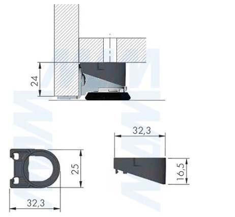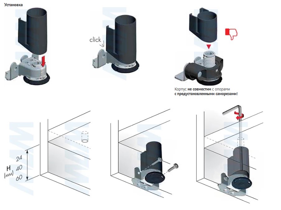 • регулировка осуществляется через отверстие ∅8 мм, просверленное насквозь в дне конструкции, с использованием любого инструмента — крестообразной отвертки или отвертки с прямым шлицом, либо шестигранного ключа 6 мм;