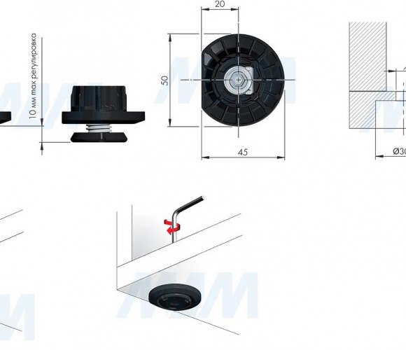 • регулировка осуществляется через отверстие, просверленное насквозь в дне конструкции, шестигранными ключами 4 или 6 мм;