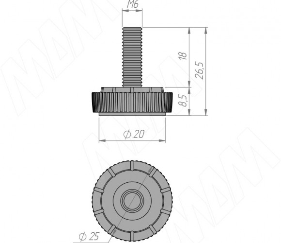 Подпятник регулир., круглый М6х20 Белый + Гайка М6
