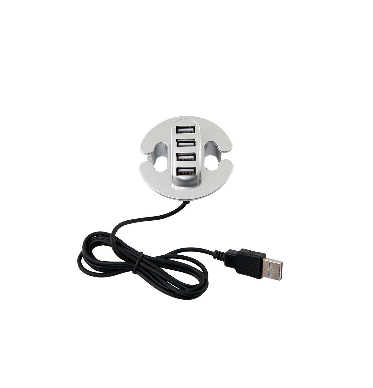 Разветвитель для USB на 4 порта серебро - удобное устройство на работе и в быту, когда вам необходимо одновременно подключить несколько приборов с USB-штекерами. Разветвитель имеет 4 входа USB и устанавливается в столешницу, в предварительно сделанное отверстие соответствующего диаметра. Конструкция предусматривает проёмы в корпусе, позволяющие использовать разветвитель как заглушку кабель-канала.