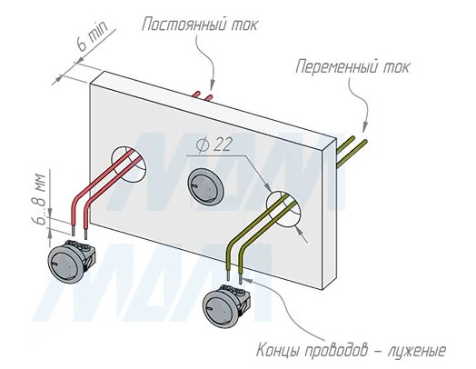 Установка и подключения: подготовить установочное отверстие ∅22 мм; зафиксировать провода в пружинных терминалах.