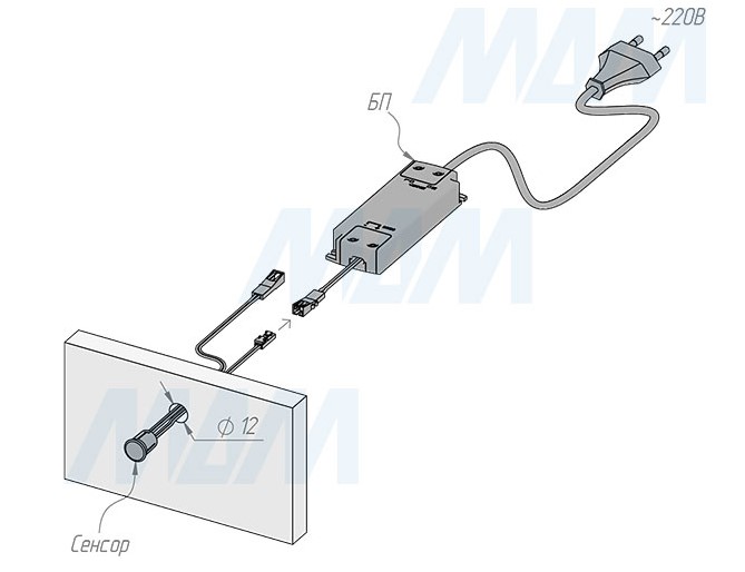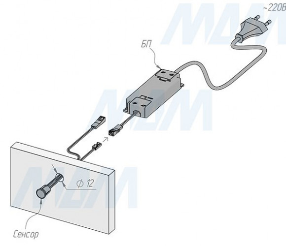 Внимание! Выключатель может работать в напряжение 12В и 24В, но провода выключателя оснащены коннекторами для напряжения 12В. Для подключения светильников и блока питания с рабочим напряжением 24В необходимо дополнительно приобрести провода-«переходники».
