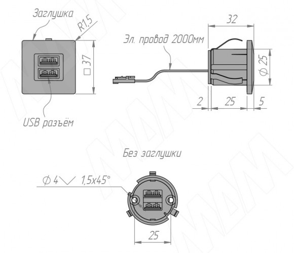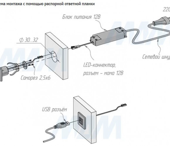 USB-розетка легко монтируются в различные виды корпусной и мягкой мебели.