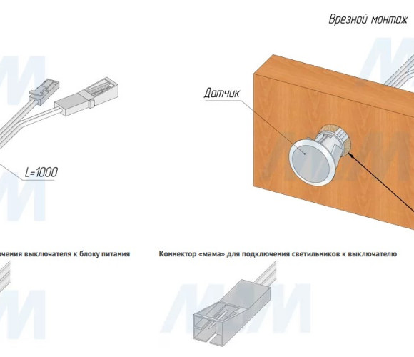 Внимание! Выключатель может работать в напряжение 12В и 24В, но провода выключателя оснащены коннекторами для напряжения 12В. Для подключения светильников и блока питания с рабочим напряжением 24В необходимо дополнительно приобрести провода-«переходники».