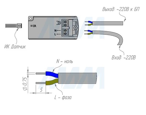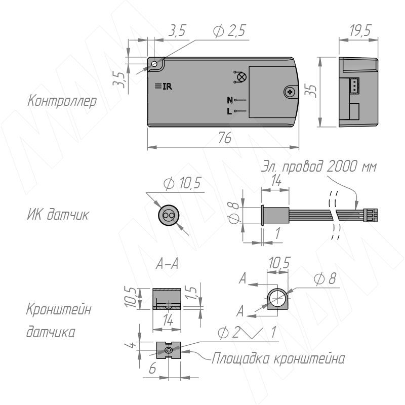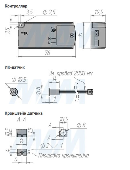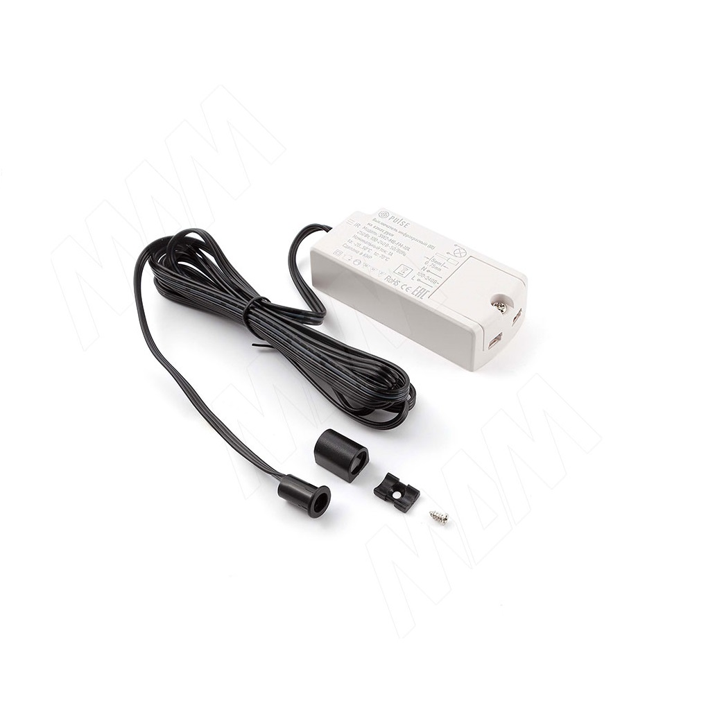 Комплектация: инфракрасный датчик с проводом, электронный блок, крепление для накладного монтажа, саморез