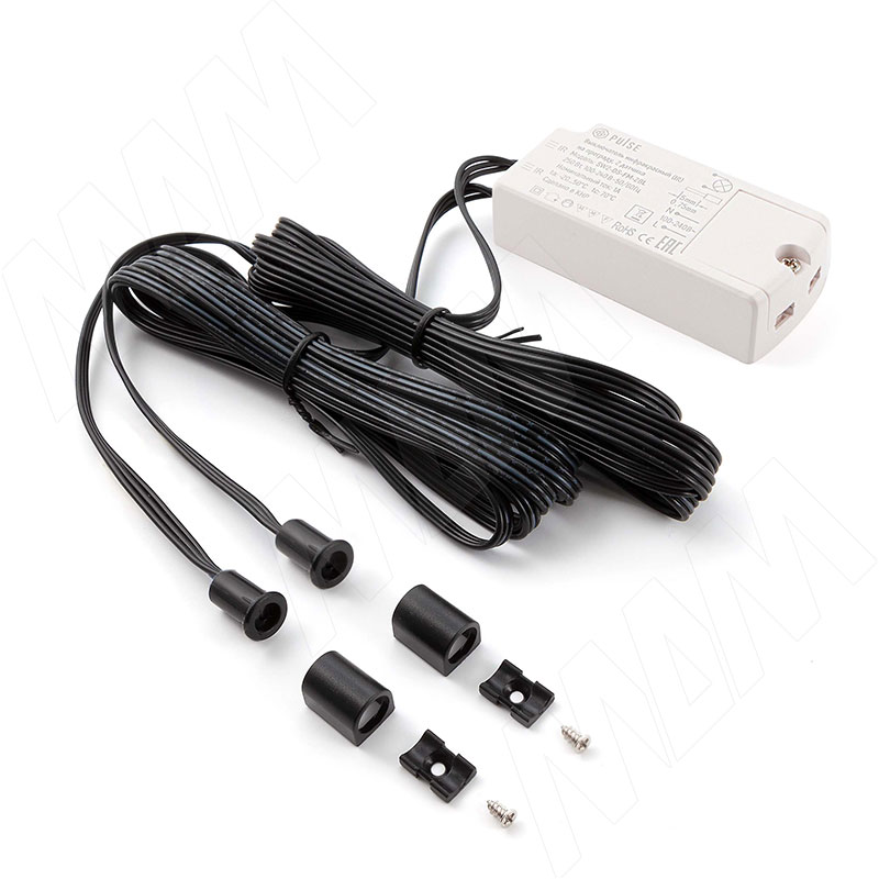 Комплектация: инфракрасный датчик с проводом — 2 шт., электронный блок, крепление для накладного монтажа — 2 шт., саморез — 2 шт.