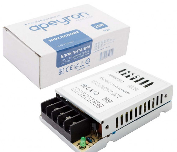 Блок питания Apeyron 12В, 25Вт, IP20, 2А, металл, 78*48*20мм 03-02