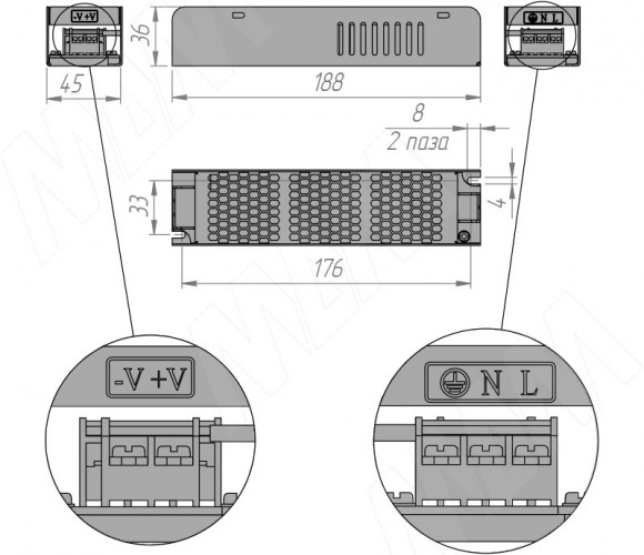 Блок питания преобразует первичное сетевое напряжение до постоянного выходного напряжения 12 В.