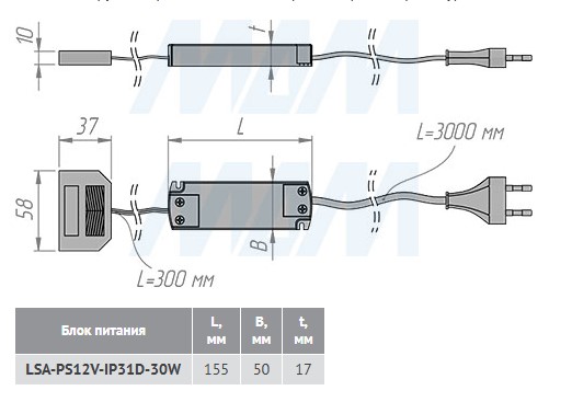 Блок питания с терминалом розеток 6шт. LED, с сет.проводом AC-230/DC-12V, IP31, 30W LSA-PS12V-IP31D-30W