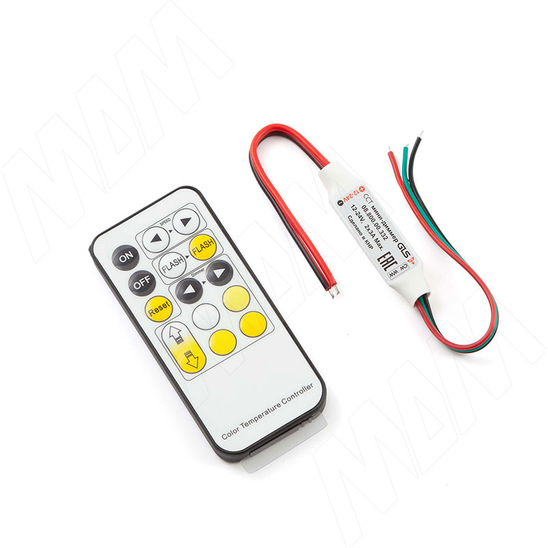 Миниатюрный диммер с радио-пультом ДУ для управления светодиодными лентами с изменяемой цветовой температурой (CCT).