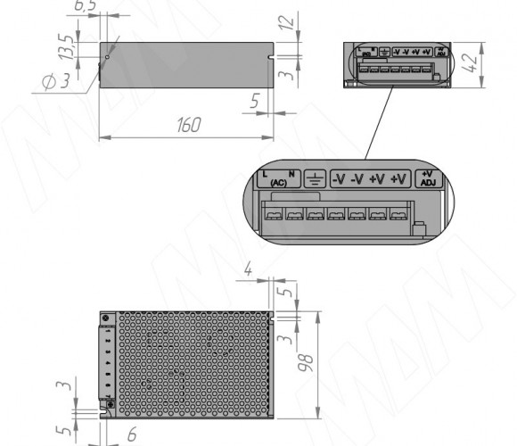 Блок питания преобразует первичное сетевое напряжение до постоянного выходного напряжения 12 В.